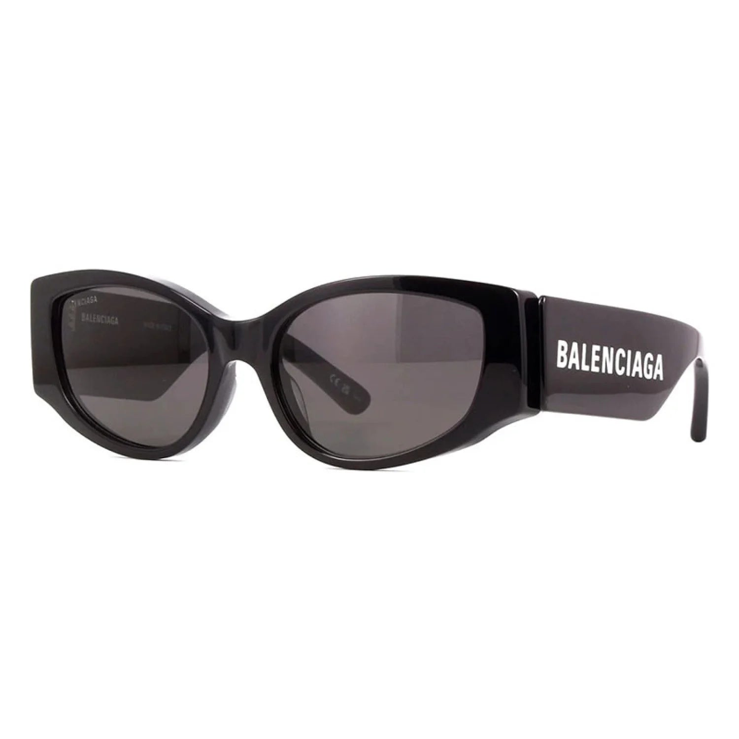 Balenciaga BB0258S sunglasses feature a bold cat-eye frame crafted from high-quality recycled acetate, designed for a standout everyday look. The oversized lettering logo on the temple, achieved through a refined lapping process, adds a signature statement edge. Ideal for women seeking full-rim style with UV-protective plastic lenses.