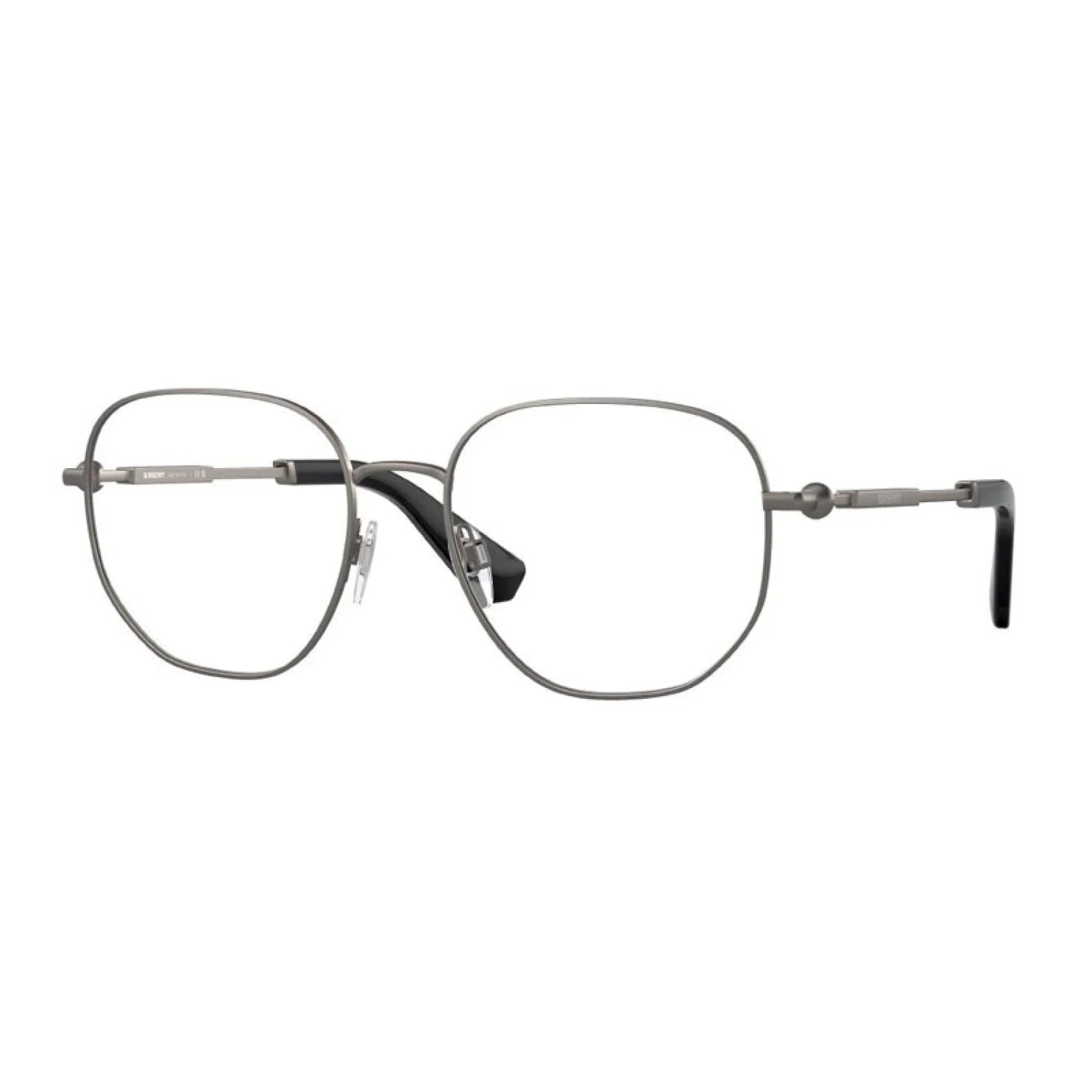 Burberry BE1385 eyeglasses feature an oversized square shape with a full-rim metal frame for a sleek, unisex look. The design includes innovative sphere hinges on the metal temples and recycled acetate temple tips for added comfort and durability. Temples incorporate the iconic Burberry check pattern, enhancing sophistication while offering excellent lens clarity and UV protection.