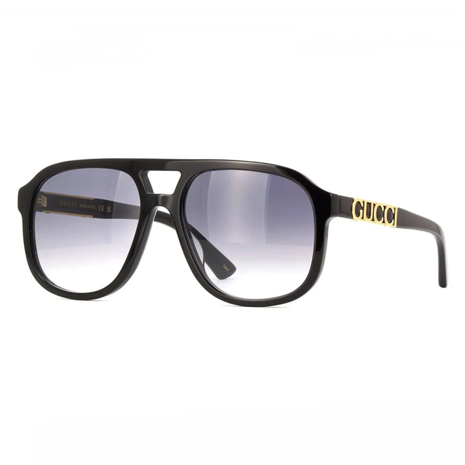 Gucci GG1188S sunglasses feature a timeless aviator shape crafted from lightweight acetate for all-day comfort and durability. The sleek black frame with subtle gold accents pairs with gradient grey lenses that offer superior UV protection and a stylish tinted effect.