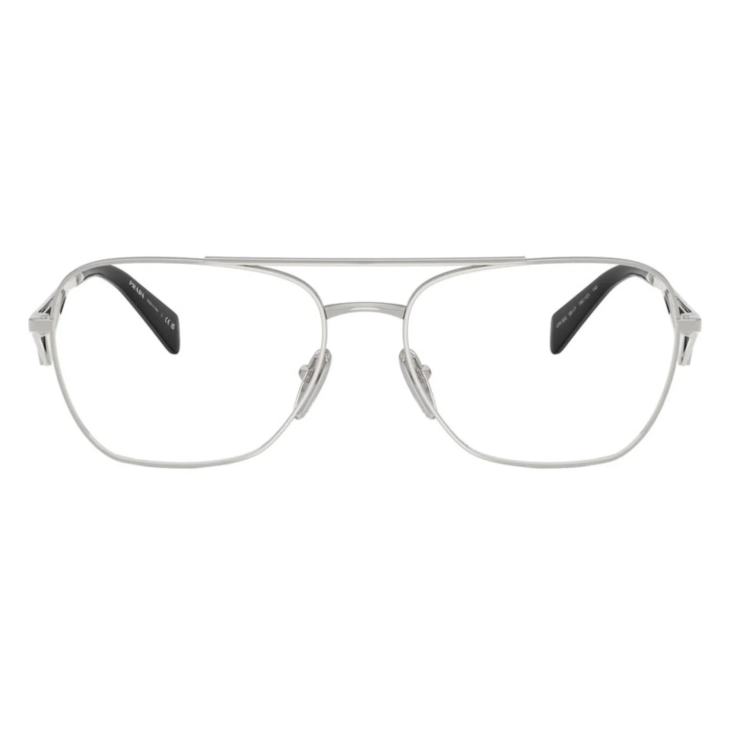 The Prada PRB50V eyeglasses feature a sophisticated pilot shape crafted from durable metal, offering a timeless and elevated aesthetic. The design includes the iconic Prada triangle detail on the openwork temples, which transition into comfortable acetate tips. This frame blends expert craftsmanship with luxury, providing a statement piece that is compatible with prescription lenses.