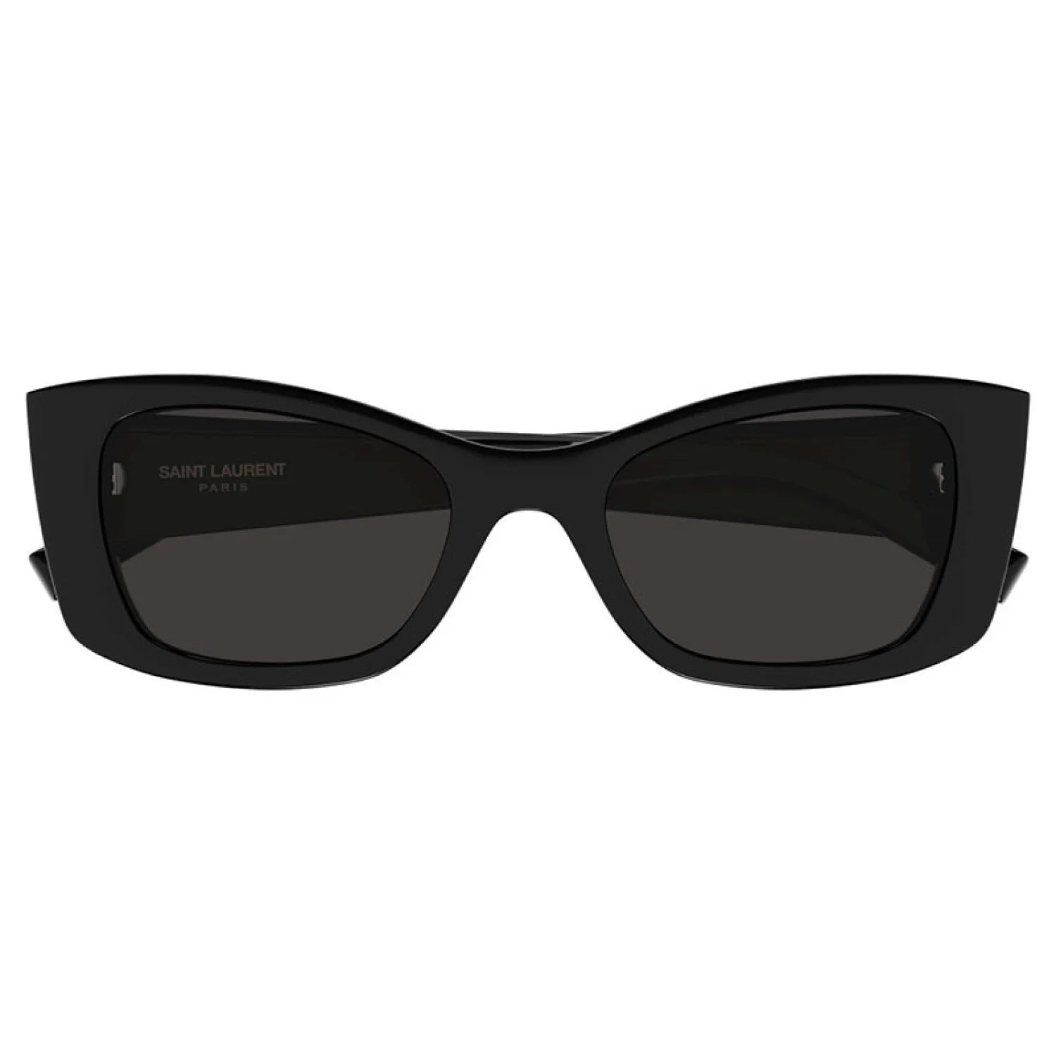 Saint Laurent SL593 52mm features a bold, shiny black acetate cat-eye frame with dark tinted lenses, offering a statement look and distinctive fashion attitude.
