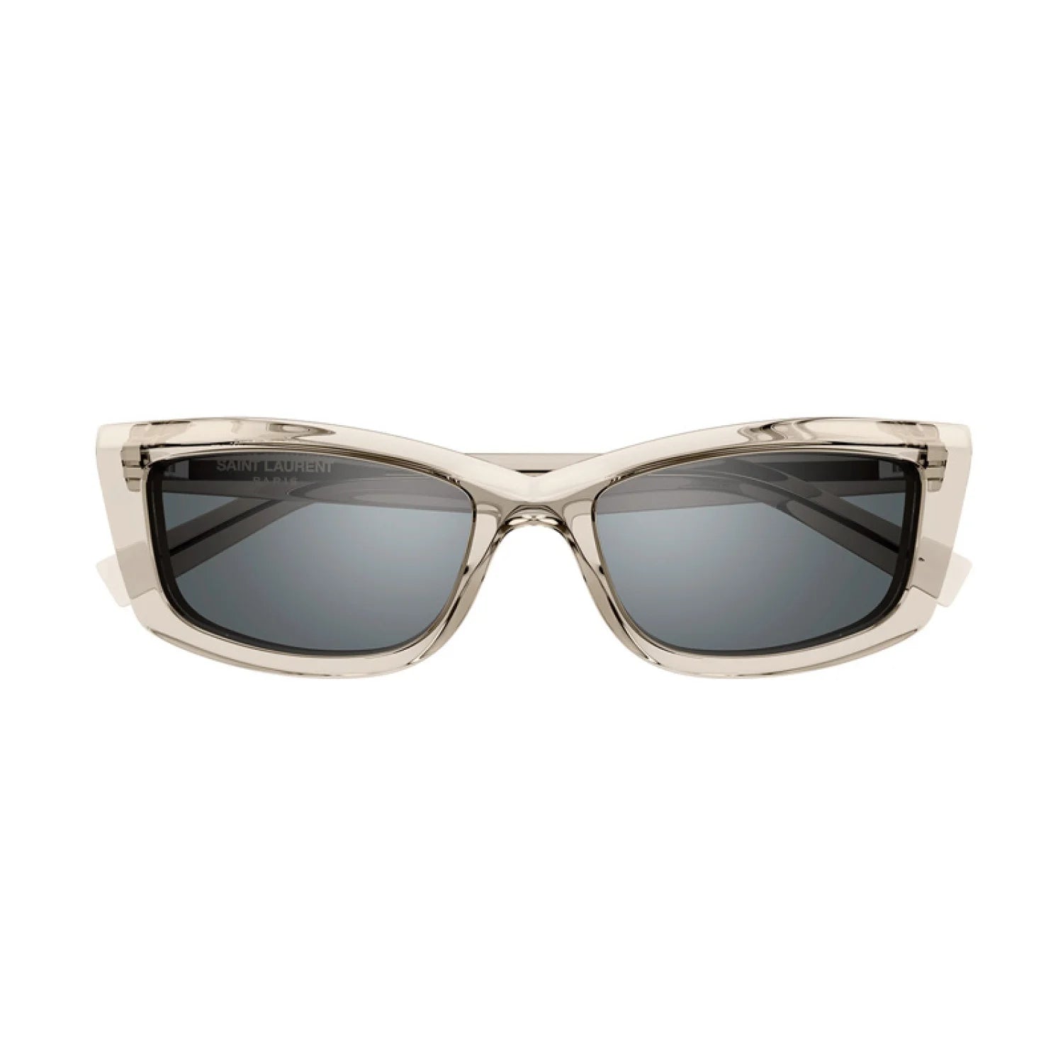 Saint Laurent SL658 54mm sunglasses feature an iconic narrow cat-eye silhouette with sharp faceted acetate detailing, combining minimalist '90s-inspired design with modern luxury. They have a subtle, curved top design and engraved Saint Laurent branding on the temple, embodying refined Parisian glamour and craftsmanship.